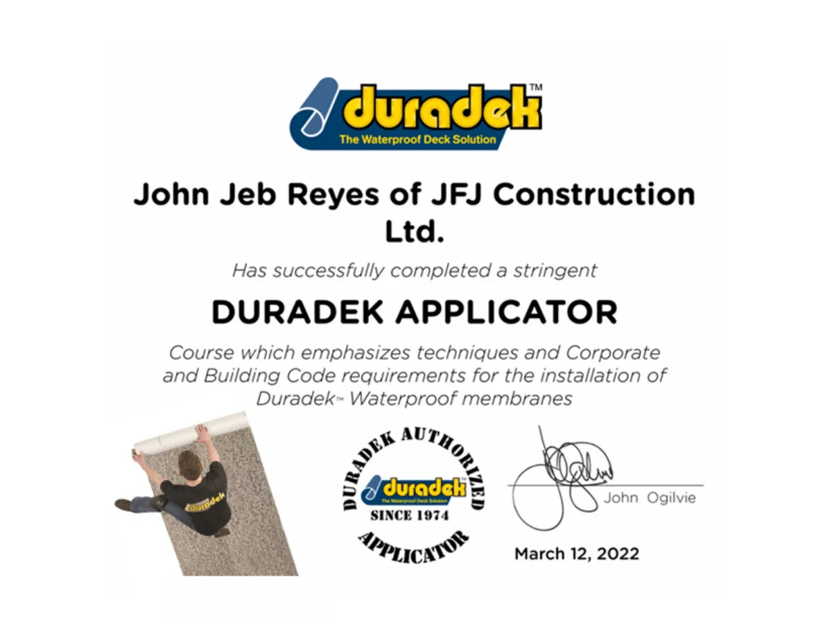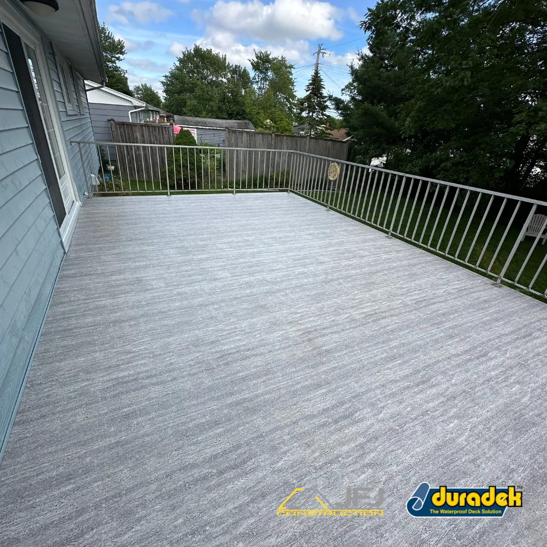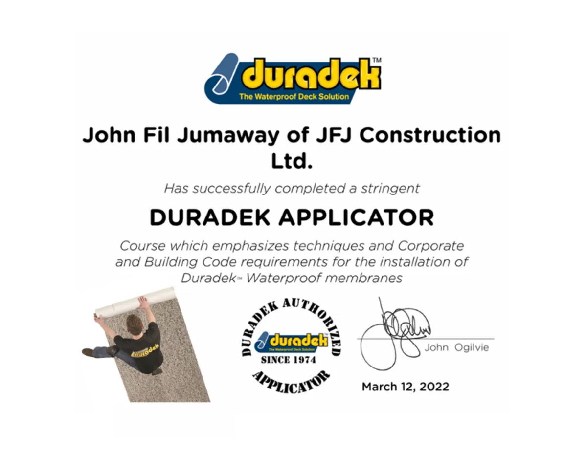 JFJ did a fantastic job on my Duradeck install. The whole process was prompt and customer friendly. The office staff who deals with quoting and customer inquiry were great. John was excellent to deal with in answering technical questions and his general construction knowledge is plentiful. The install process was very well done. They did a thorough prep job for filling plywood seems and imperfections. The finish install of the vinyl product was nothing less than perfect. Would 100% recommend JFJ for anyone looking for Duradeck. - Nick